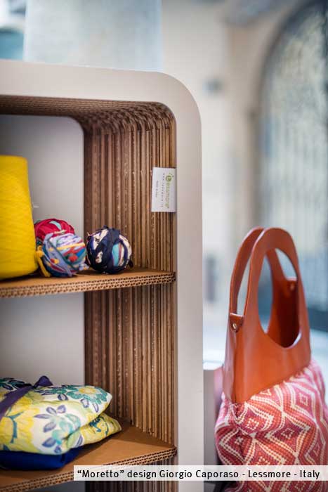 Arredi ed espositori  in cartone Lessmore per Kaleydos. Design Giorgio Caporaso