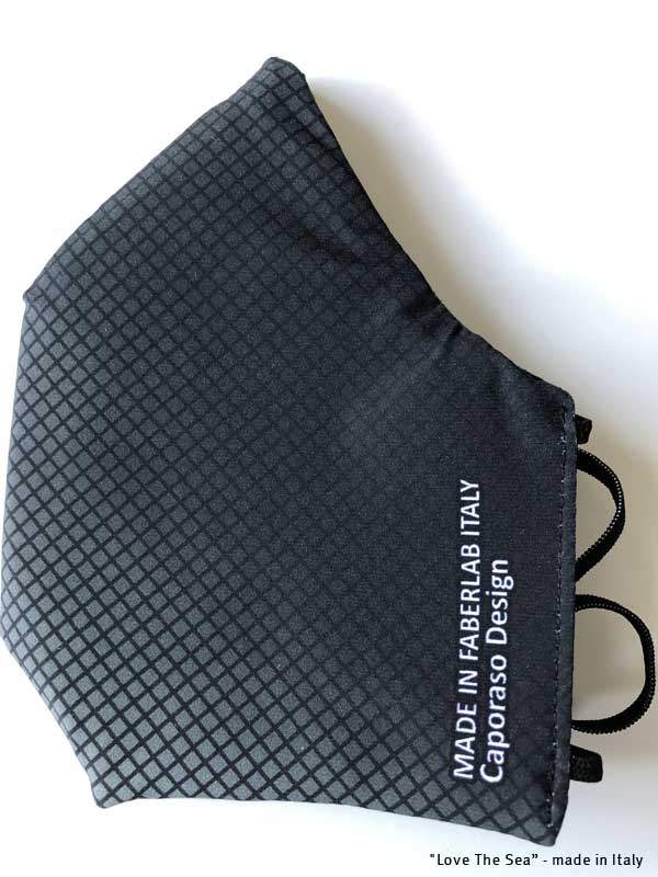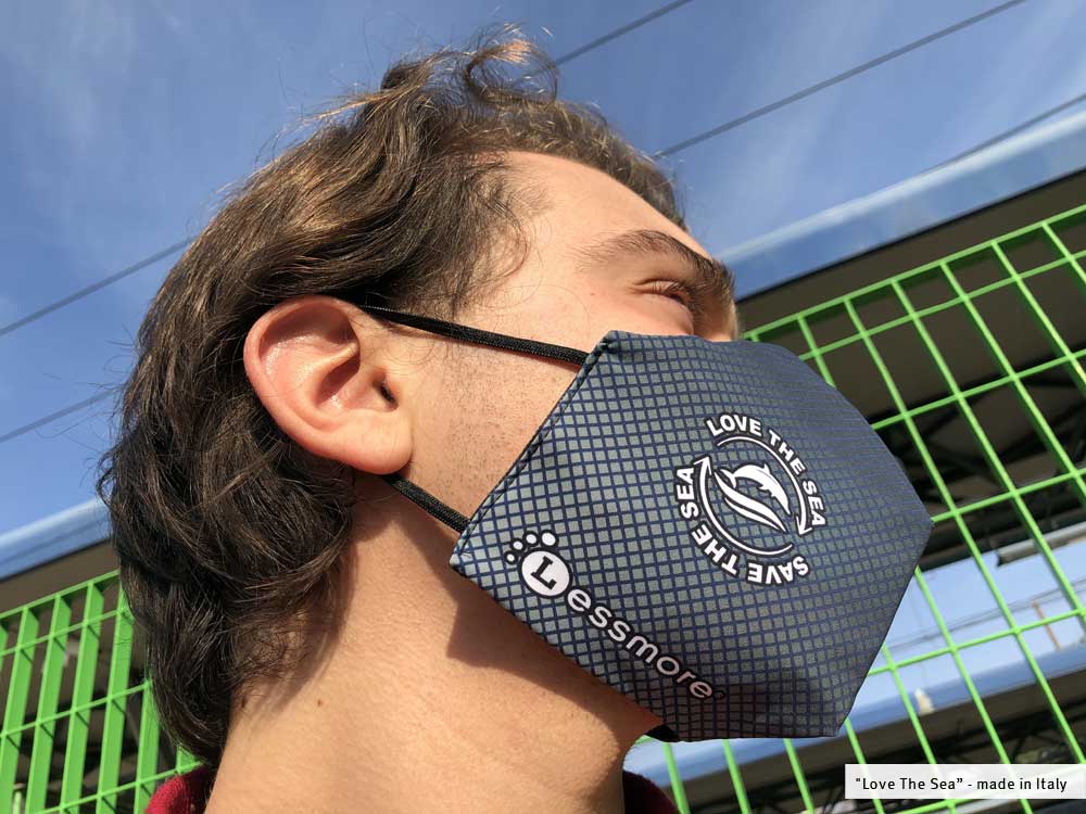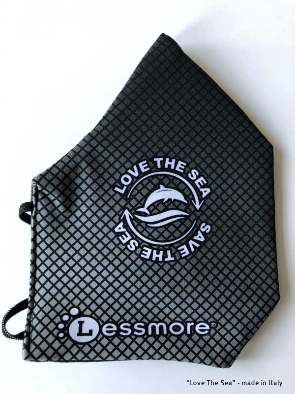 Love the Sea è una mascherina speciale, lavabile e riutilizzabile in tessuto Carvico e Jersey Lomellina realizzato in ECONYL®, un filo di Nylon 100% rigenerato da materiali di scarto pre e post consumer come le reti da pesca.